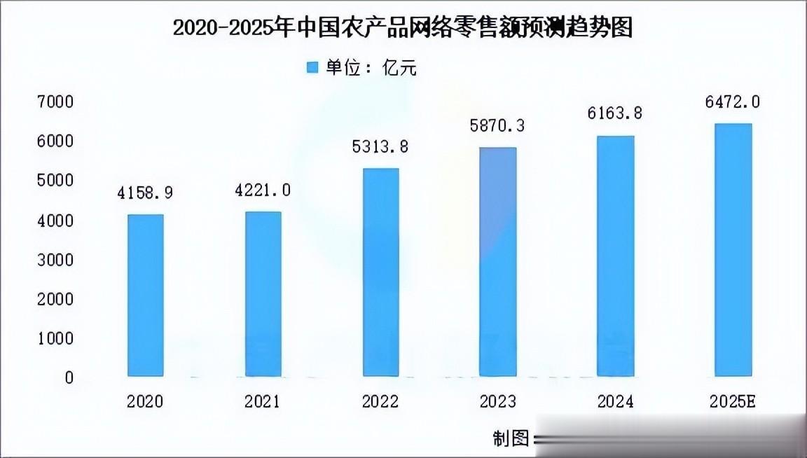 农业农村部数据显示,2023年全国农产品网络零售额达5870.3亿元,比上年增长12.5%,连续多年保持较快增长,呈现出东中西部竞相发展、各类农产品加速覆盖的良好态势,特别是为打赢脱贫攻坚战、有效应对三年疫情作出了独特贡献,在很大程度上变革了农产品传统流通方式,形成了新的流通模式,已经成为农村数字经济发展的突破口和领头羊。预计2025年中国农产品网络零售额将达到6472亿元。