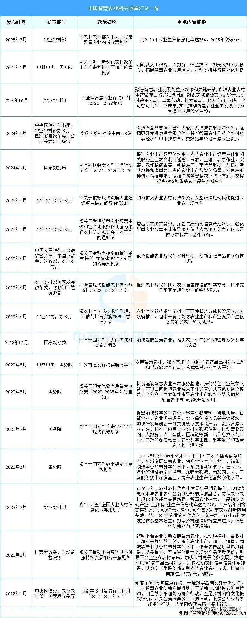 近年来,中国智慧农业行业受到各级政府的高度重视和国家产业政策的重点支持。国家陆续出台了多项政策,鼓励智慧农业行业发展与创新,《农业农村部关于大力发展智慧农业的指导意见》《关于进一步深化农村改革扎实推进乡村全面振兴的意见》《全国智慧农业行动计划(2024—2028年)》等产业政策为智慧农业行业的发展提供了明确、广阔的市场前景,为企业提供了良好的生产经营环境。具体情况列示如下: