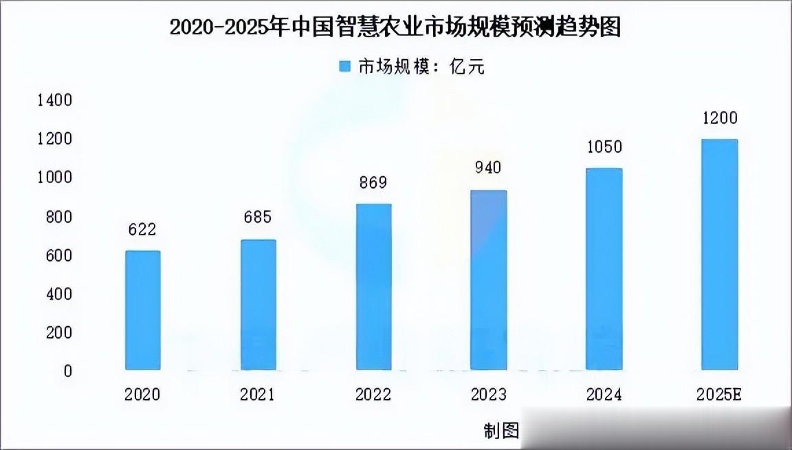 随着物联网、大数据、人工智能等技术的不断发展,以及政策的持续支持,中国智慧农业市场规模保持快速增长的态势。2024年中国智慧农业市场规模超千亿元,达到约1050亿元,预计2025年将达到1200亿元。