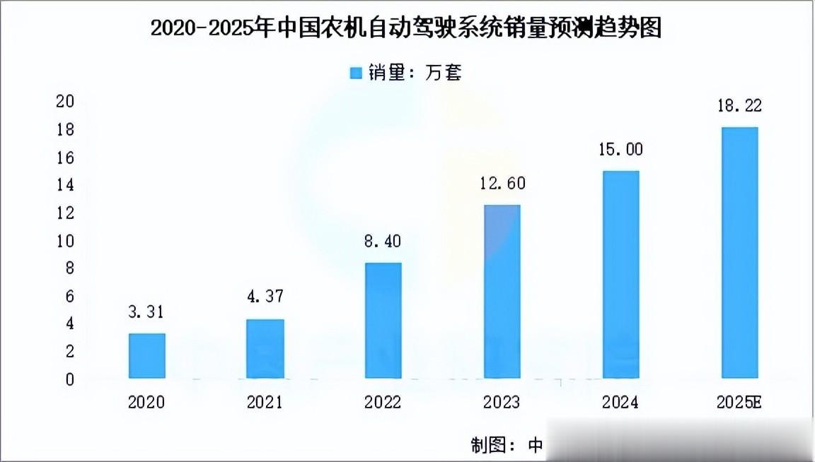 随着智慧农业的战略新兴发展趋势和国家政策的大力支持,农业科技得到快速发展,我国农机自动驾驶系统产品在2019年后逐渐完成了国产替代,行业随后逐渐进入规模化应用阶段并迅速发展。根据中国农业机械流通协会发布的报告,以购置补贴数据统计,2022年中国农机自动驾驶系统销量达到8.4万套,2023年国内农机自动驾驶系统销售数量达到12.60万套,同比增长50%,预计2025年销量将达到18.22万套。