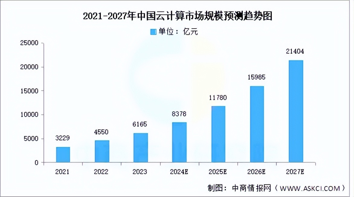 2023年我国云计算市场规模达6165亿元,较2022年增长35.5%,大幅高于全球增速。随着AI原生带来的云计算技术革新以及大模型规模化应用落地,我国云计算产业发展将迎来新一轮增长曲线,预计2025年市场规模将达1.18万亿元,2027年将超过2.1万亿元。