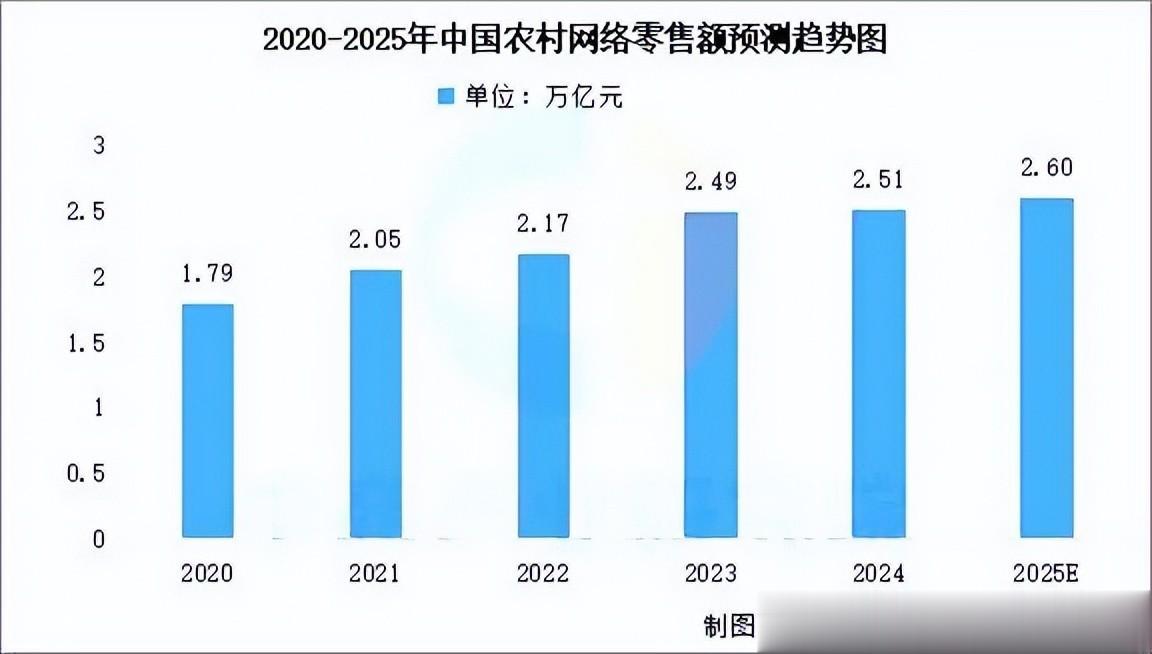近年来,中国农村电商市场蓬勃发展,农业农村部数据显示,2023年中国农村网络零售额达2.49万亿元,同比增长12.9%。预计2025年中国农村网络零售额将达到2.6万亿元。
