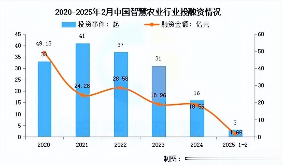 近年来,中国智慧农业行业投资事件数量及规模整体呈波动上升趋势。IT桔子数据显示,2024年我国智慧农业投资数量16起,已披露融资金额达18.59亿元。2025年1-2月我国智慧农业投资数量3起,已披露融资金额达1.66亿元。
