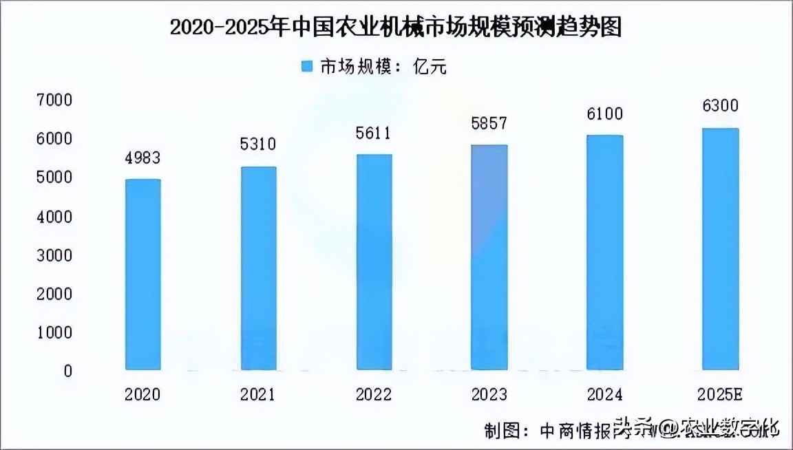 农业机械是指在作物种植业和畜牧业生产过程中,以及农、畜产品初加工和处理过程中所使用的各种机械。中国农业机械市场规模在逐年增长,为智慧农业提供了重要的硬件支持。2023年中国农业机械行业市场规模达5857亿元,同比增长4.38%,2024年市场规模约为6100亿元,预计2025年将增长至6300亿元。