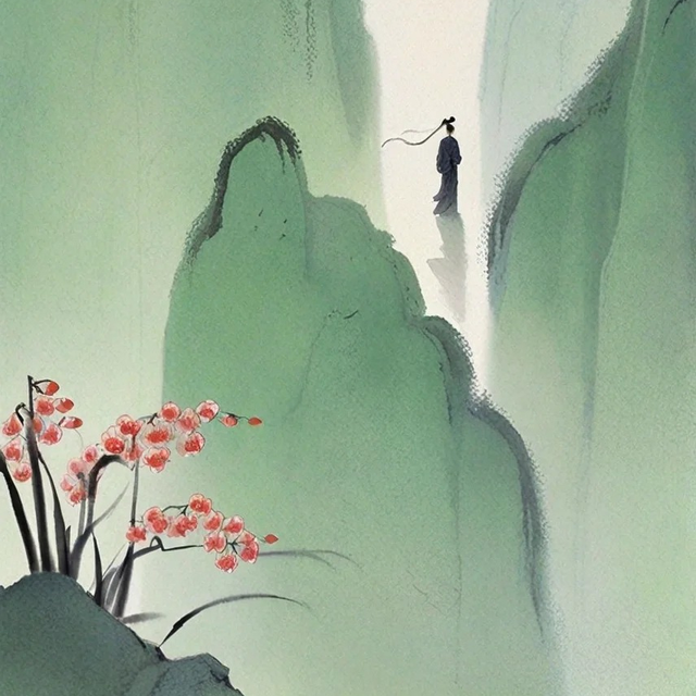 深邃的庭院,翠绿的帷幕低垂。傍晚时分,露珠晶莹,点缀着那些无人照料,却依旧自在开放的红艳花朵,自成一处风景。