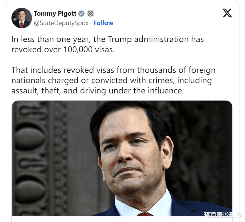 近日,美国国务院发言人汤米·皮戈特(Tommy Pigott)在社交平台X表示,自川普总统去年重返白宫以来,已经撤销超过10万张签证。据路透报道,撤销签证的规模反映川普上台后启动的广泛移民打击行动,驱逐人数前所未见,包括部分持有有效签证者。川普政府也对发放签证采取更严格的政策,包括加强社群媒体审查和扩大筛核措施。