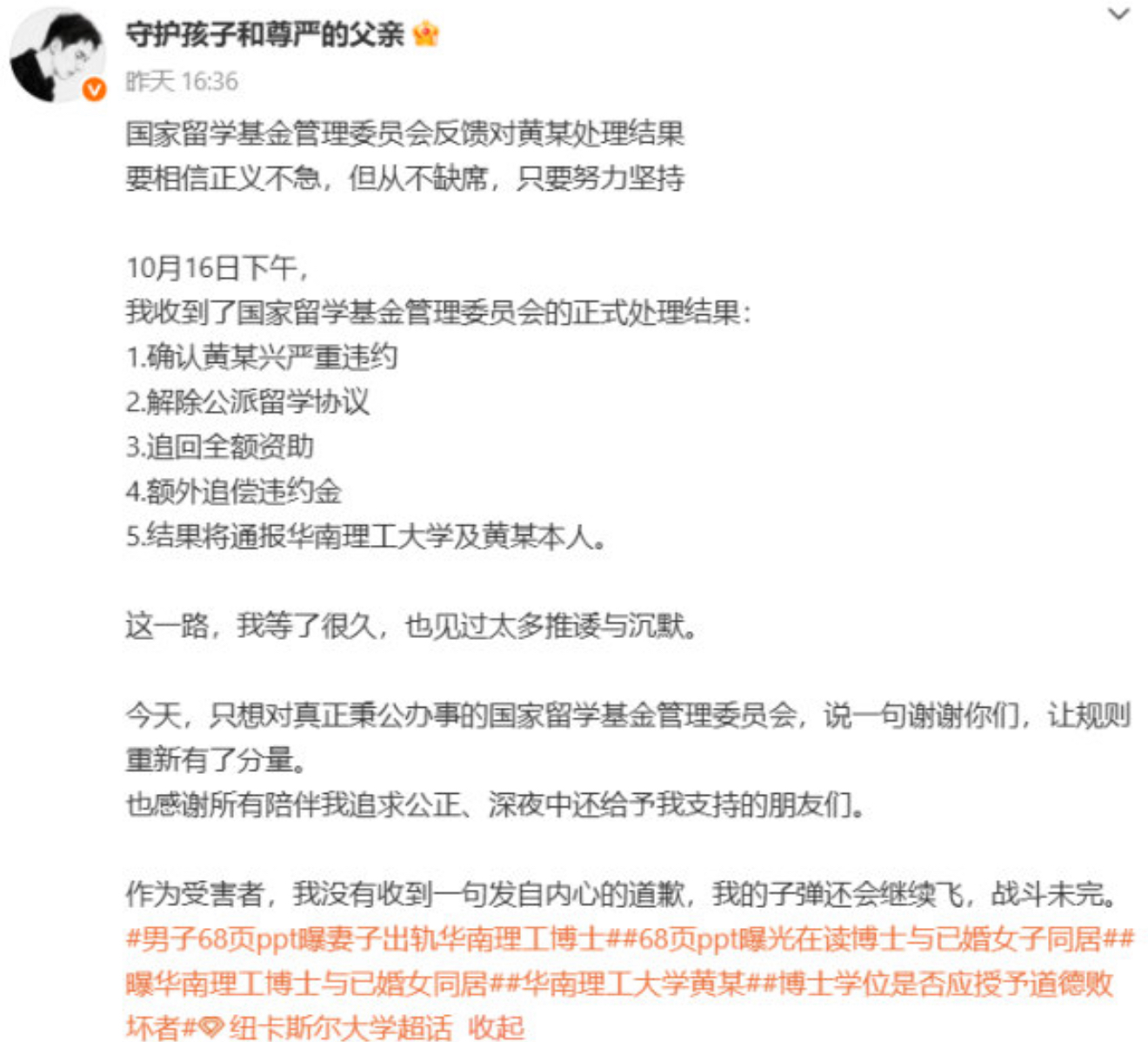这两天,一则“68页PPT举报”的新闻在网上炸开了锅。杭州的张先生用一份图文并茂的PPT,把妻子王某和华南理工大学在读博士生黄某兴的婚外情扒得干干净净——从英国留学时的亲密同居,到回国后连续十几天的开房记录,甚至连妻子接女儿放学时被偷拍的照片都放了进去。更扎心的是,张先生说当年卖房凑了60万送妻子出国,结果换来的是背叛。校方给黄某兴的处分是“留校察看”,国家留学基金委则直接解除了他的公派资格,追回全额资助,还让他赔了违约金。