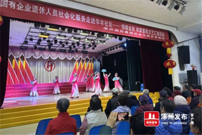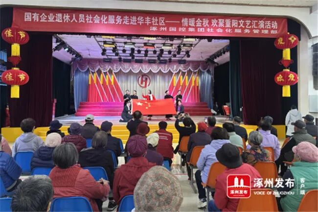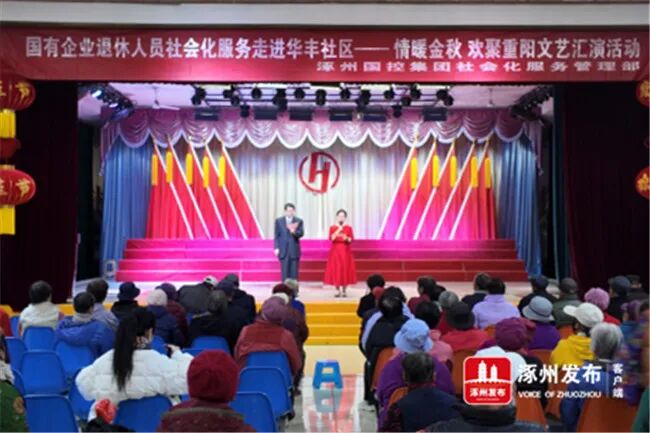 金秋送爽,情暖夕阳。10月27日,在重阳节来临之际,涿州国控集团社会化服务管理部携手涿州市新时代文明实践中心办公室、涿州市志愿者联合会走进华丰社区,举办“情暖金秋 欢聚重阳”文艺演出,向为国企发展作出重要贡献的退休老同志致以节日的诚挚问候和美好祝福。