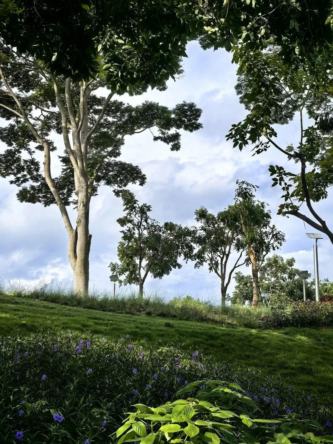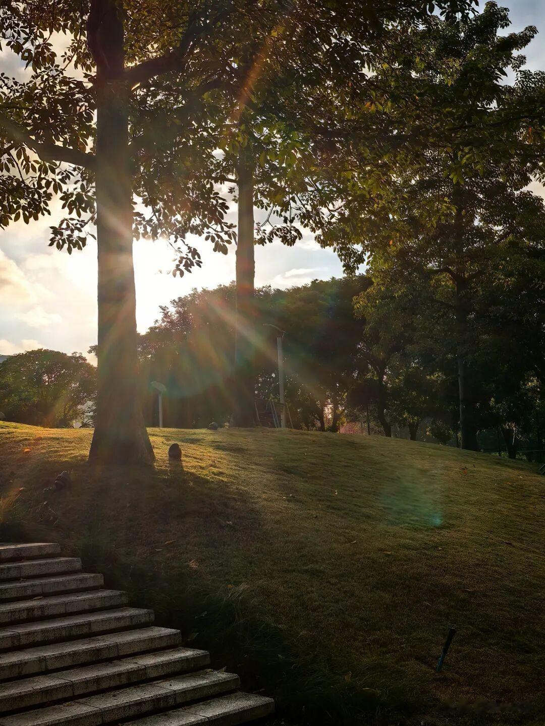 香樟树与榕树交错着,织出浓密的天然穹顶。朝霞从叶隙中泻下,给挂露的青草镀上亮边,空气里拂动着独有的草木清气。