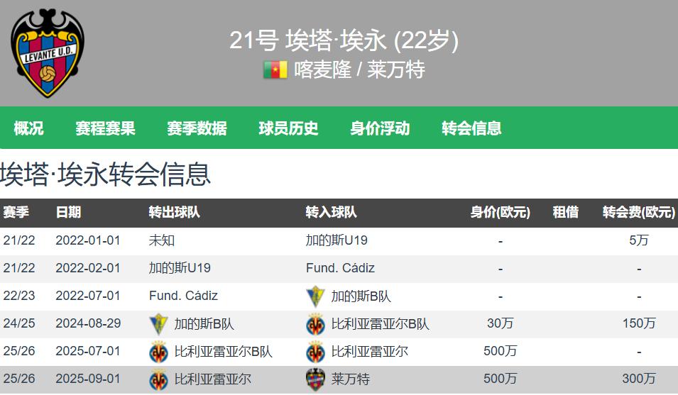 艾永出自加的斯青训,随后转投比利亚雷亚尔青训,球员于2025年夏窗以300万欧元的转会费从黄潜加盟莱万特,当时球员的身价仅为500万欧元,如今已经暴涨至2000万欧元。
