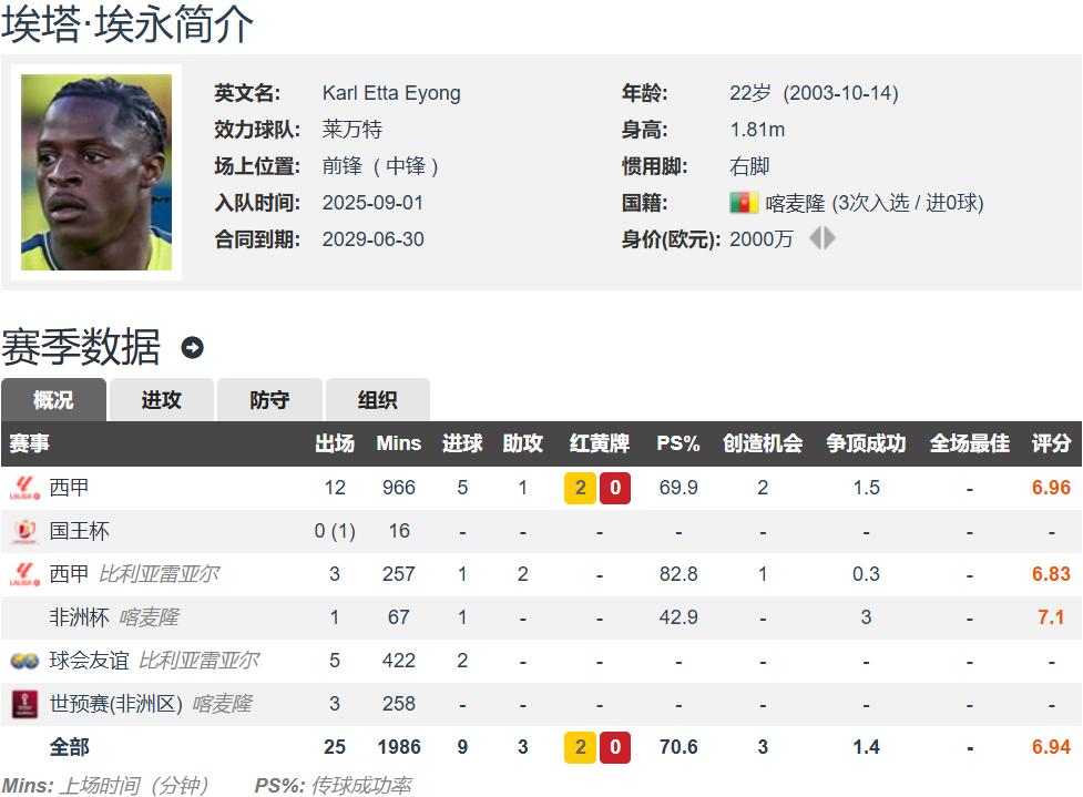 现年22岁的艾永,身高1.81米,右脚中锋,与莱万特的合同至2029年,本赛季至今出战了16场比赛,其中15次首发,贡献6球3助。