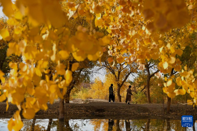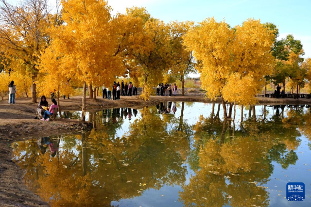 金秋十月,甘肃敦煌多地胡杨林被秋色渲染,吸引游客前来赏景打卡拍照。新华社发(张晓亮 摄)