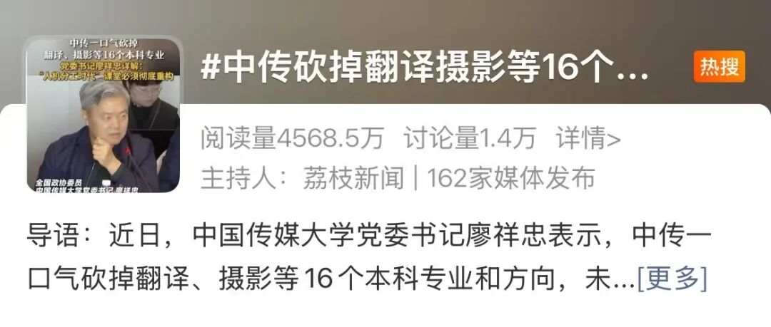 比如中传一口气砍掉16个本科专业还上了热搜 图源:微博
