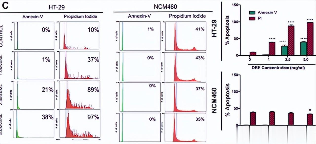 通过进一步的研究,研究人员发现DRE并非通过DNA损伤发挥作用,而是通过破坏癌细胞的线粒体膜电位,诱导线粒体膜电位丧失和活性氧水平升高,从而启动程序性细胞死亡。在HT-29细胞中,DRE处理导致caspase-8活性增加68%,同时碘化丙啶染色上升30%,表明细胞凋亡途径被激活。