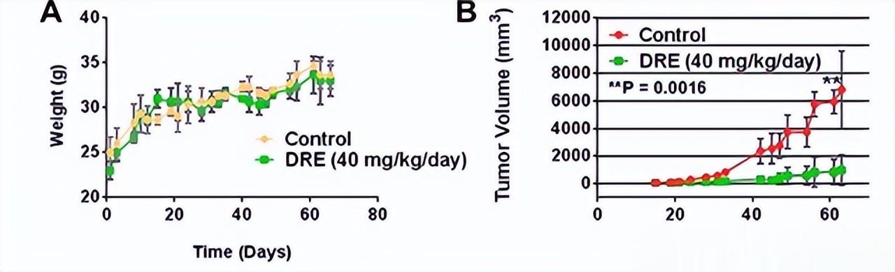 不过想要测试真实的安全性及有效性,显然仅仅是体外实验还是不够的,所以研究人员再从进行了更为复杂的动物活体实验。他们在健康的Balb/c小鼠身上,以40毫克/千克/天的剂量,连续给小鼠口服DRE长达75天。在整个过程中,通过密切监测小鼠的体重变化(一个反映整体健康状况的敏感指标)以及分析尿液中的蛋白质含量(评估肾脏功能),发现DRE处理组与仅服用安慰剂的对照组小鼠之间没有任何显著差异。