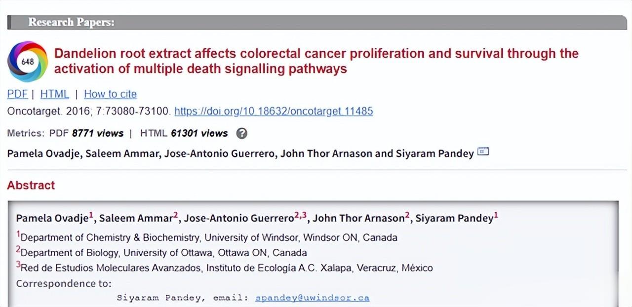 二、加拿大研究:蒲公英提取物可在48小时内杀死癌细胞!蒲公英,作为一种广泛分布在全球的常见植物,无论是中国,还是西方的民间医学中都有着悠久的应用历史,常被用于清热解毒、保肝利胆。而近年来现代药理学研究发现其更多的生物活性,就比如除了传统的用途外,该加拿大实验室的早期体外(在培养皿中)预实验表明蒲公英根部提取物(DRE)能够在包括白血病、胰腺癌、黑色素瘤在内的多种人类癌细胞模型中抑制细胞增殖,并诱导其死亡,而对于从同一组织分离的非癌细胞,则观察不到明显的毒性效应。