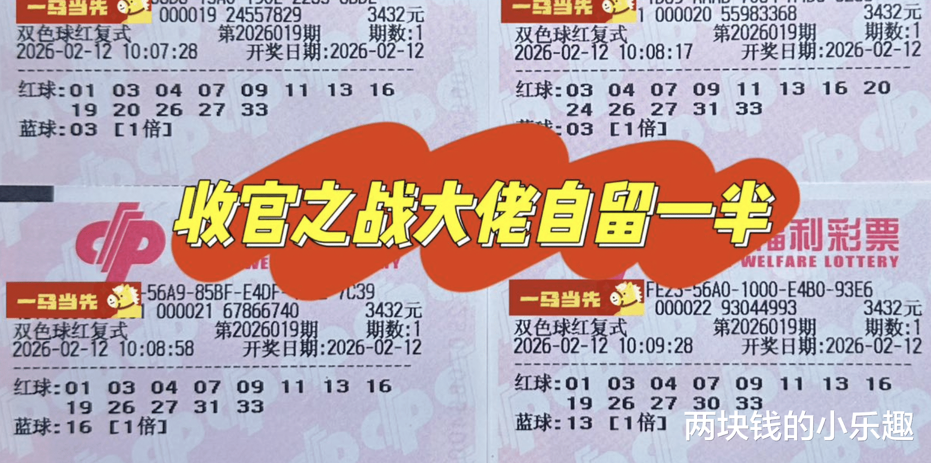 以上就是本期的全部内容是,剩余的都是一些各种规格,组合各异的千元不等的复式,领衔的是13+2的6864复式,上期画风一变,突然贡献了三张,本期又回归了初始两张的状态,其余3696和1848等复式纷纷亮相,不过最后一张比较具有吸引力,是由4张复式组合成的团队,这4张都是同规格13+2的3432复式,总体投入近1.4万,所以这必然是团队共同打造而非一人贡献,有意思的是,这几张票红球仅仅是微调其中一两个号,不过蓝球除03相同外,还选了13和16,但总体来看,这几张票变化并不大,看来团队成员对自己所选是比较有信心的,不知运气会不会成就本期的奇迹呢!