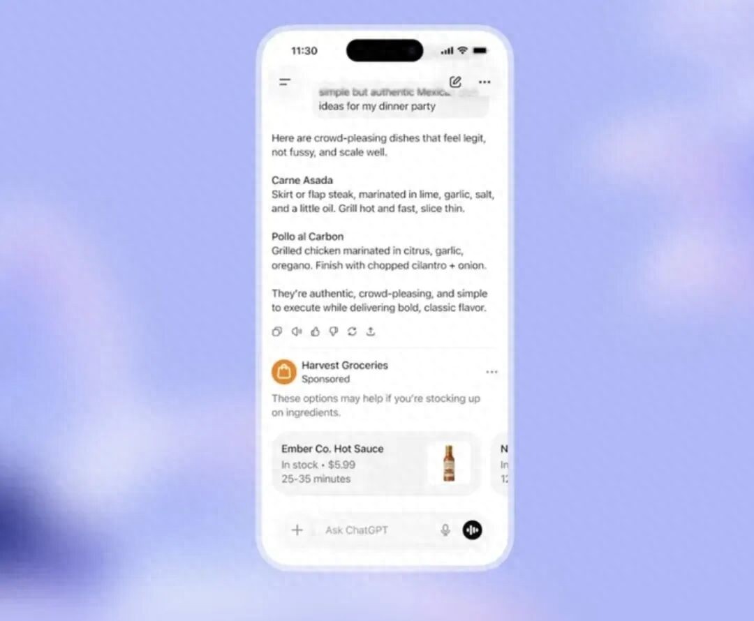 比如你问一道墨西哥菜的做法,ChatGPT 会先把菜谱写得明明白白,最后在下面放一条辣酱品牌的赞助内容。界面看上去依然干净,甚至还有点“高级感”。