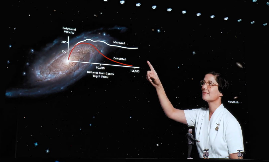 他先讲了“为什么叫 Vera Rubin”:这位天文学家通过星系旋转曲线的异常发现暗物质存在。
