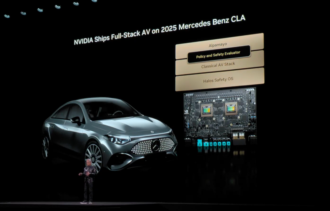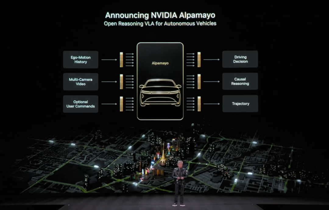 黄仁勋宣布了AlphaMyo,强调它是端到端训练的自动驾驶 AI:从摄像头输入到控制输出,训练数据包含人类示范驾驶与 Cosmos 生成的大规模合成里程,再叠加大量精细标注样本。