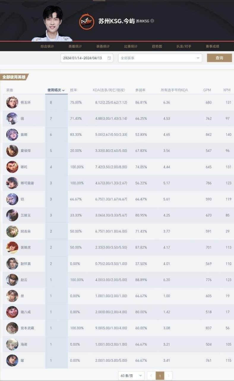 截止到KPL春季赛第三轮第一周,KSG今屿在本赛季已经使用了十七个不同的英雄。