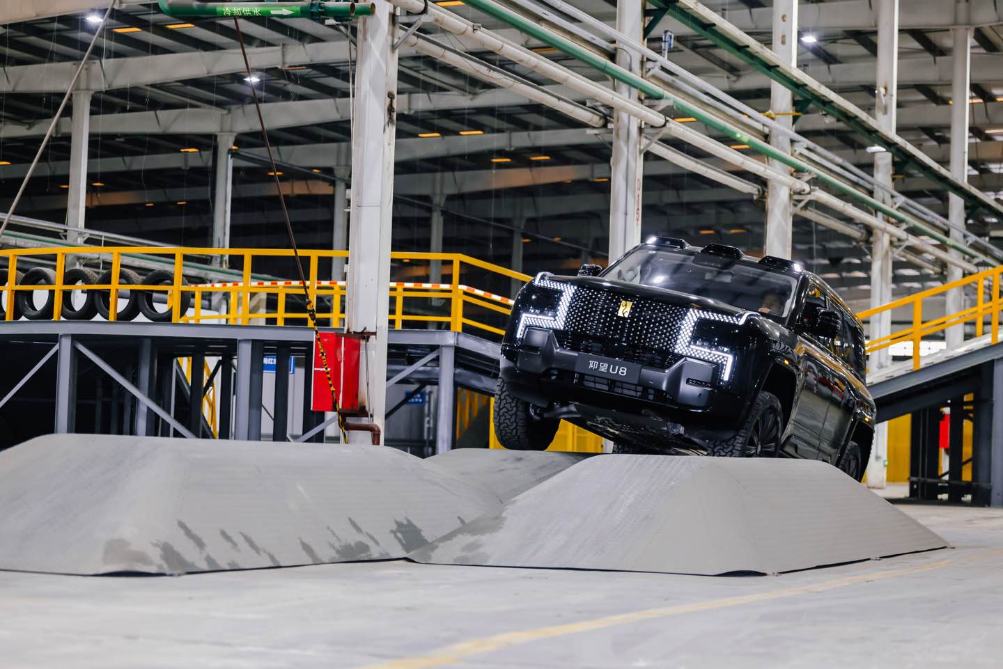实测现场的表现更是充满惊喜,磨得发亮的45°超滑坡道,普通人站上去都容易打滑,仰望U8却能正爬倒爬、轻松悬停;复刻的35°天门山天梯,窄阶+钢面双重考验下,它倒爬起来依旧丝滑顺畅,核心还是eTCS 2.0+易四方,不用手动锁差速、不用选模式,自动识别地形精准控扭,会踩油门就能征服极限,这才是电驱越野的终极形态