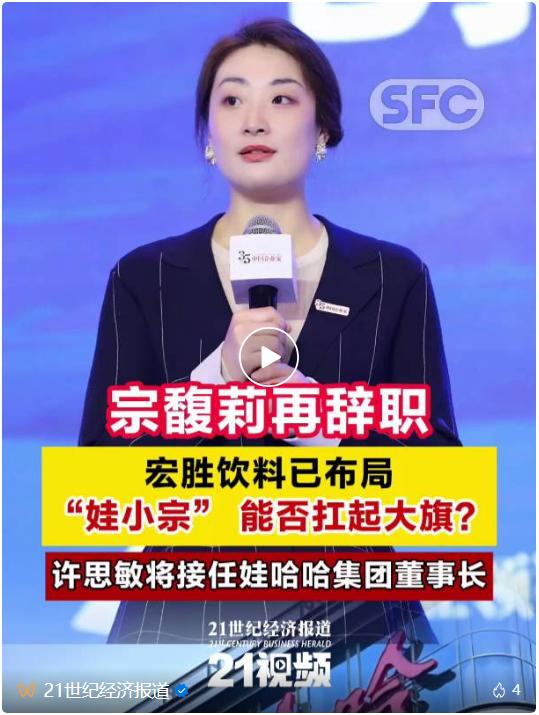 另有消息称,原宏胜集团法务部长许思敏将接任娃哈哈集团董事长等职务。