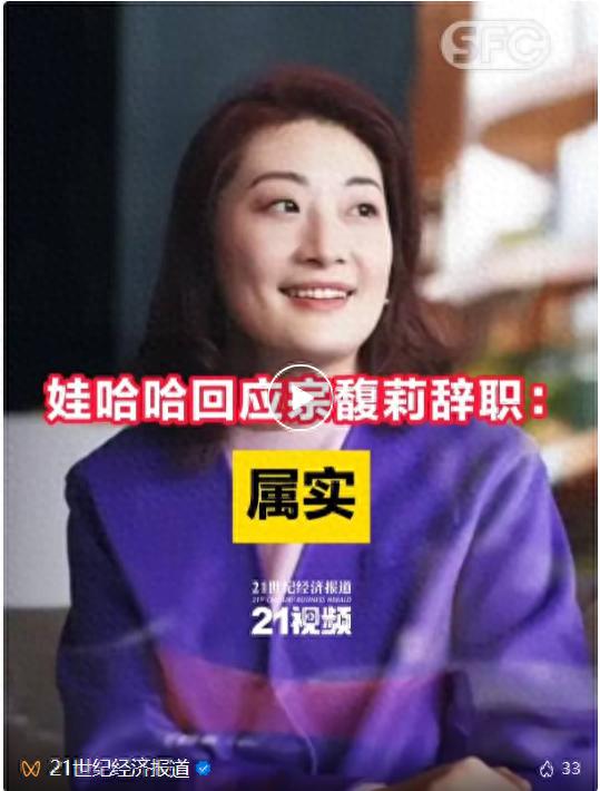 就在10月10日晚,宗馥莉被曝已于9月12日向娃哈哈集团有限公司辞去公司法定代表人、董事及董事长等相关职务,并已通过集团股东会和董事会的相关程序。娃哈哈集团相关人士向21世纪经济报道记者确认为“属实”。