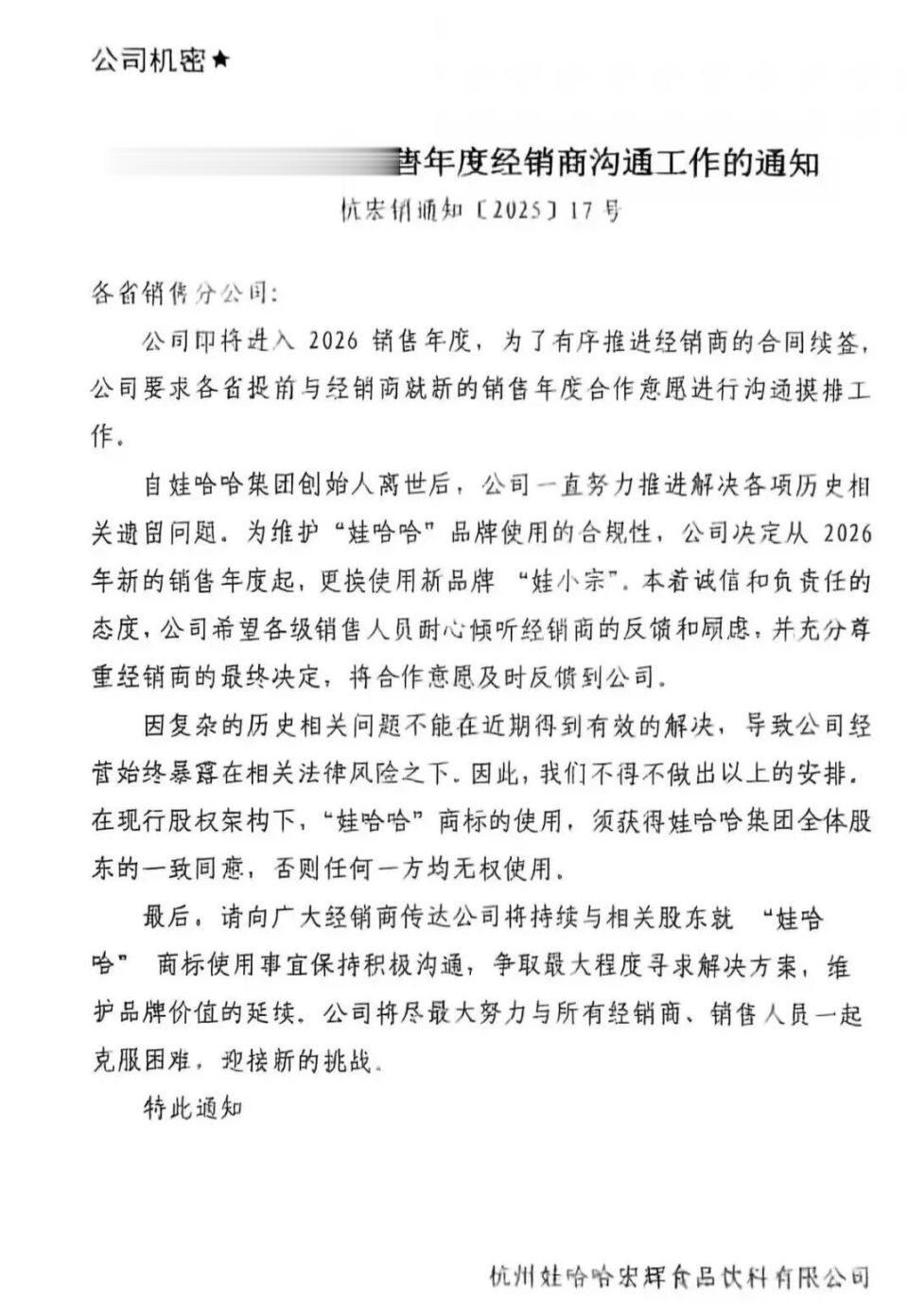 9月13日,杭州娃哈哈宏辉食品饮料有限公司“关于开展2026销售年度经销商沟通工作的通知”的一份内部文件流出,其中提到,“自娃哈哈集团创始人离世后,公司一直努力推进解决各项历史相关遗留问题。”为维护“娃哈哈”品牌使用的合规性,公司决定从2026年新的销售年度起,更换使用新品牌“娃小宗”。【详情:娃哈哈内部文件流出!宗馥莉或另立门户】