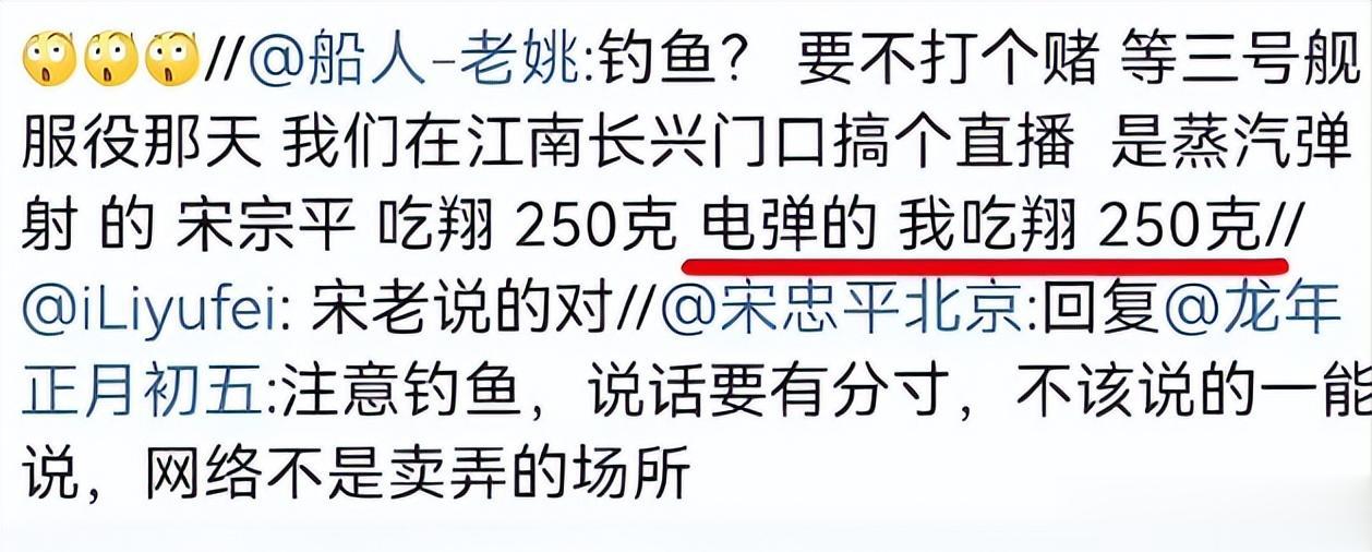 要在三号舰服役那天搞个直播,如果还是蒸汽弹射,宋就得吃250克的翔,如果不是,那自己就吃250克的屎。