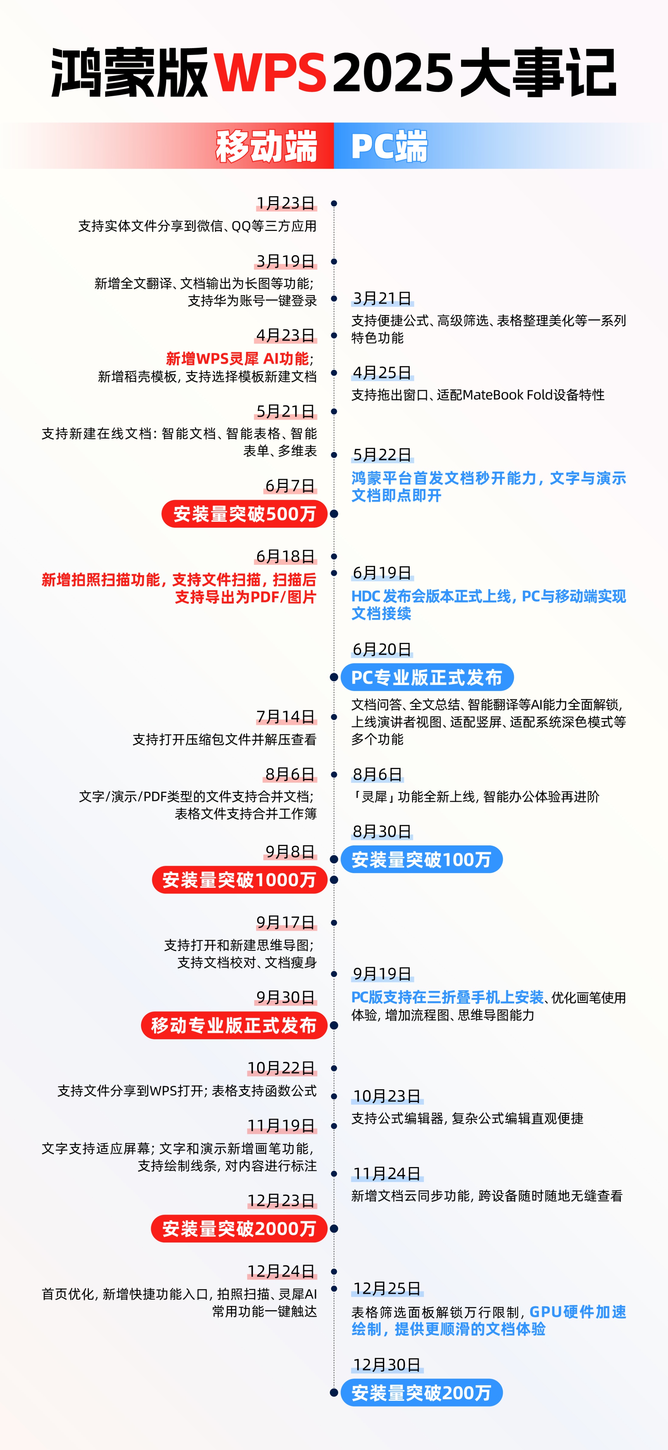 产品升级带动用户规模快速增长。WPS鸿蒙版移动端12月安装量超2000万,PC端达200万,成为越来越多个人用户的办公首选。这些成果也为2026年WPS鸿蒙版AI办公体验升级,进一步深耕个人消费者赛道提供了有力支撑。