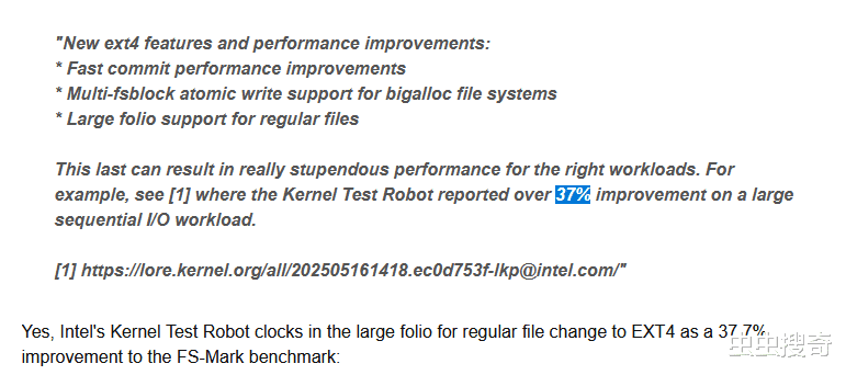 默认的Ext4文件系统,则在性能方面获得改善。通过加速提交路径、支持大folio 以及为bigalloc文件系统引入原子多块写入,Ext4在顺序I/O工作负载下的速度提升最高可达37%,普通用户在文件拷贝、数据处理等场景中将能直观地感受到响应速度的提升。