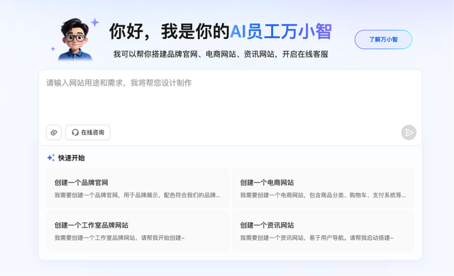 在万小智正式定名前,“AI官网神器”、“智能建站大师”这类名字曾被列为候选。但团队很快意识到,这些名字指向的是一条已被反复验证的老路——“AI建站”。