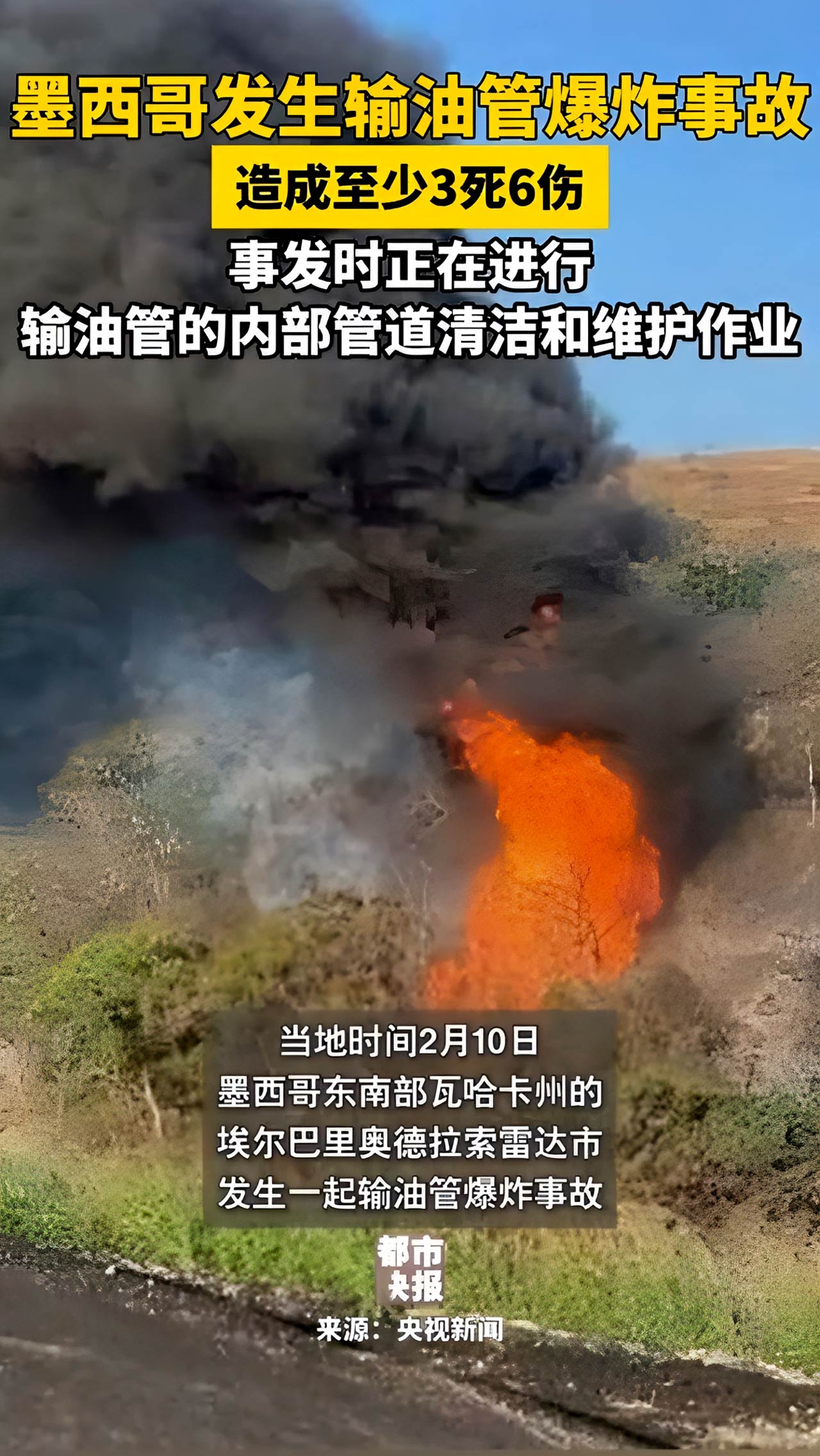 当地时间2月10日,墨西哥东南部瓦哈卡州境内一条输油管道发生爆炸事故,造成3人死亡、6人受伤,伤者已被送往当地医院接受救治,暂无生命危险通报。