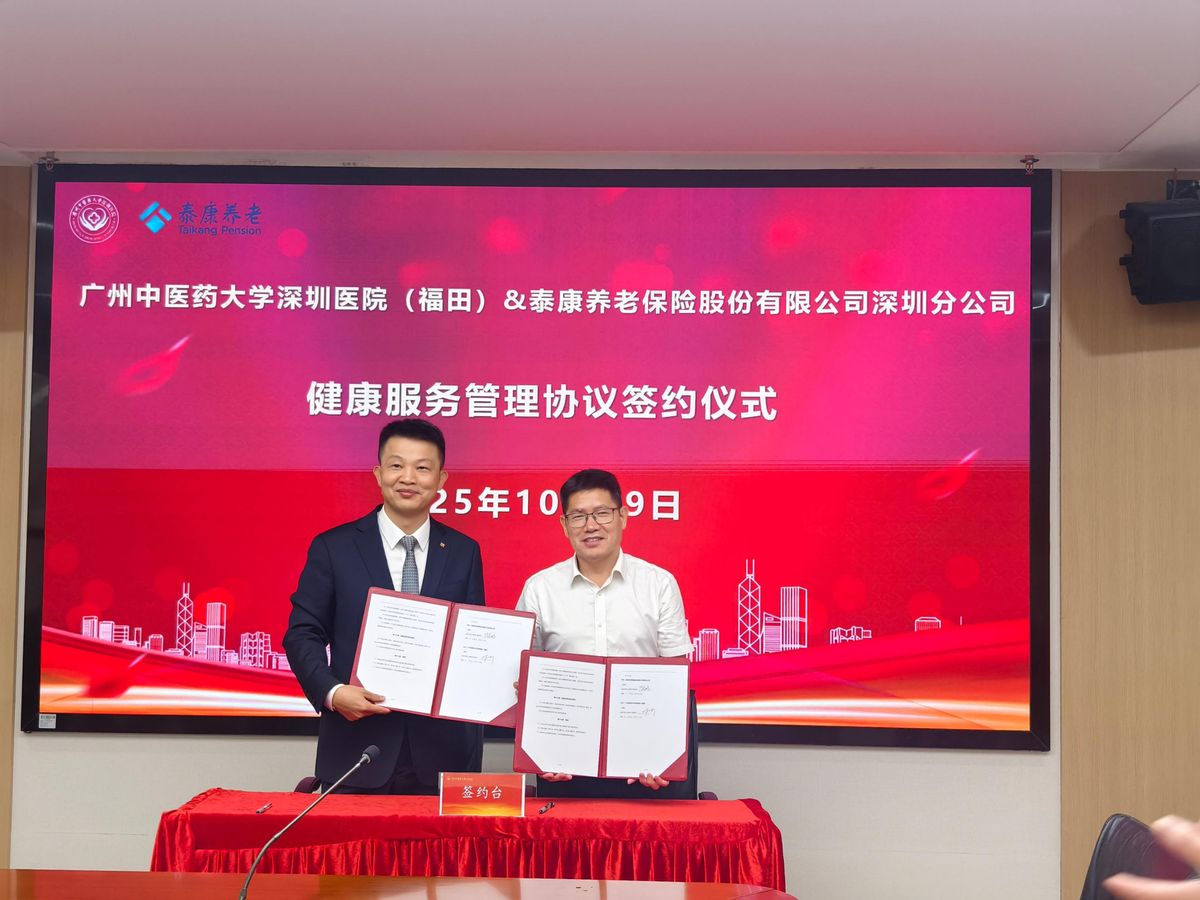 2025年10月29日,广州中医药大学深圳医院(以下简称:广中医深圳医院)与泰康养老保险股份有限公司深圳分公司(以下简称:泰康养老深圳分公司)正式签署战略合作协议。泰康养老深圳分公司总经理陈俊鹏、行业合作部总经理黄阳等高层管理人员,广中医深圳医院院长林汉利、总会计师李燕如及相关科室负责人共同出席签约仪式。