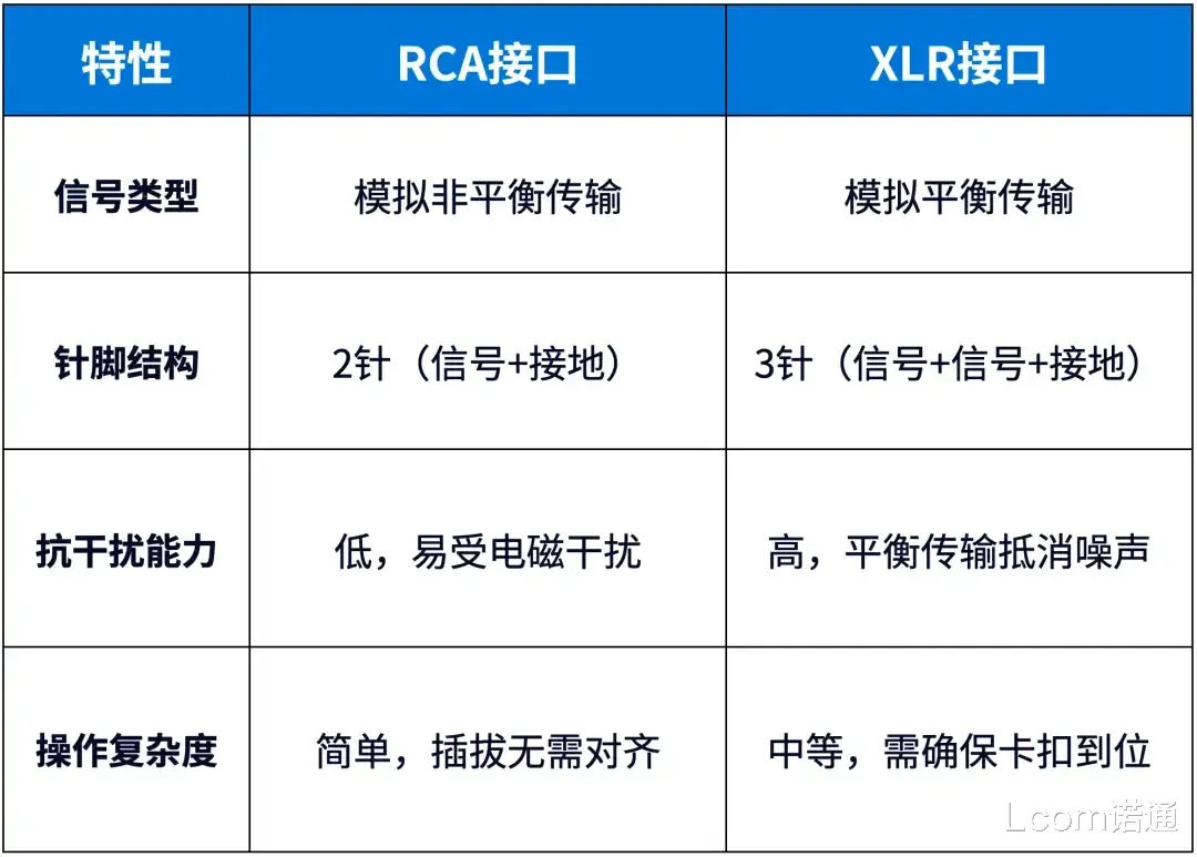 RCA接口和XLR接口经常会拿来进行对比,它们在音频领域都有各自的优劣势,我们通过一个表格来进行简单对比。