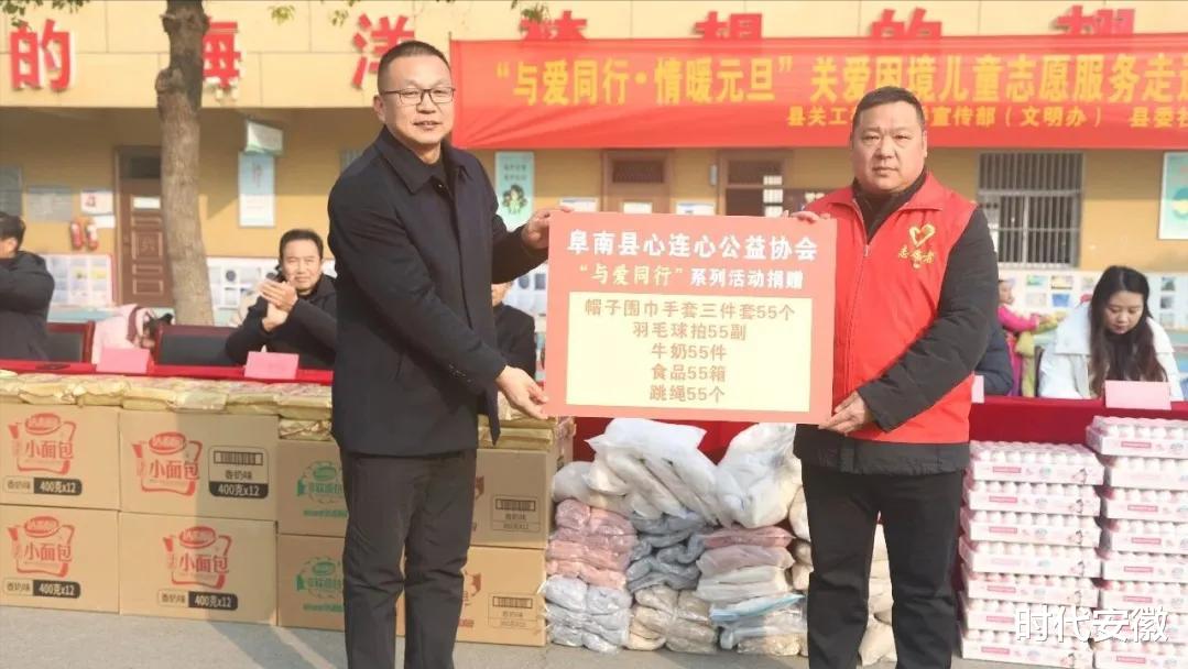 活动现场,阜南县关工委常务副主任周莉,会龙镇党委副书记、镇长葛瑶,阜南县委社工部二级主任科员、社会建设协调室主任陈维平,阜南县心连心公益协会会长常磊,会龙镇党委委员郭晓雅等领导嘉宾悉数到场,与孩子们亲切互动,详细询问他们的学习生活情况。一箱箱牛奶、一份份食品、一套套保暖的帽子围巾手套、一副副羽毛球拍、一根根跳绳,55份爱心物资整齐排列,不仅是物质上的帮扶,更是对孩子们精神上的慰藉,让这个寒冬充满了爱的温度。
