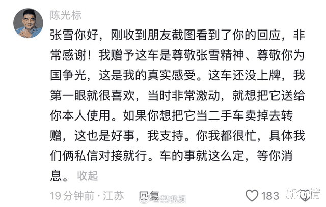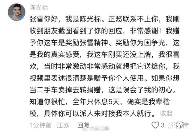 一听张雪要卖车,陈光标坐不住了,在评论区留言:“张雪你好,我是陈光标。正愁联系不上你,我刚收到朋友截图看到了你的回应,非常感谢!我赠予你这车是奖励张雪精神、奖励你为国争光,这是我的真实感受,我这车刚买还没上牌,我很喜欢,当时非常激动非常感动就想把它送给你,我视频里表述很清楚是赠予你个人使用。如果你想当二手车卖掉去转捐赠,这是误会了我的初心。知道你很忙,全年只休息5天,确实是我辈楷模,具体你可以派人来对接我本人就行。”