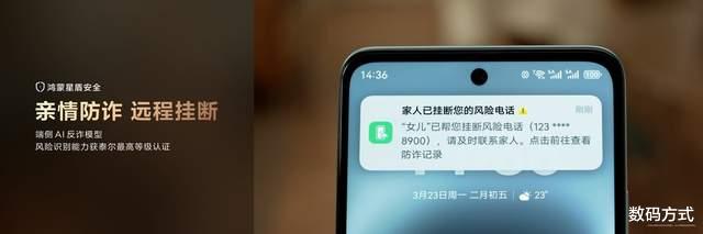 在鸿蒙AI的赋能下,华为畅享 90系列拥有超强防诈矩阵。如通过AI换脸检测技术,当家中长辈接到疑似AI合成的诈骗视频通话时,手机不仅能实时识别风险,还会向守护人发送预警。更贴心的是,被标记的诈骗号码可同步至家人的黑名单——只需一人标记,家人的手机也会同步生效,并且守护人还可以远程协助挂断高风险电话。