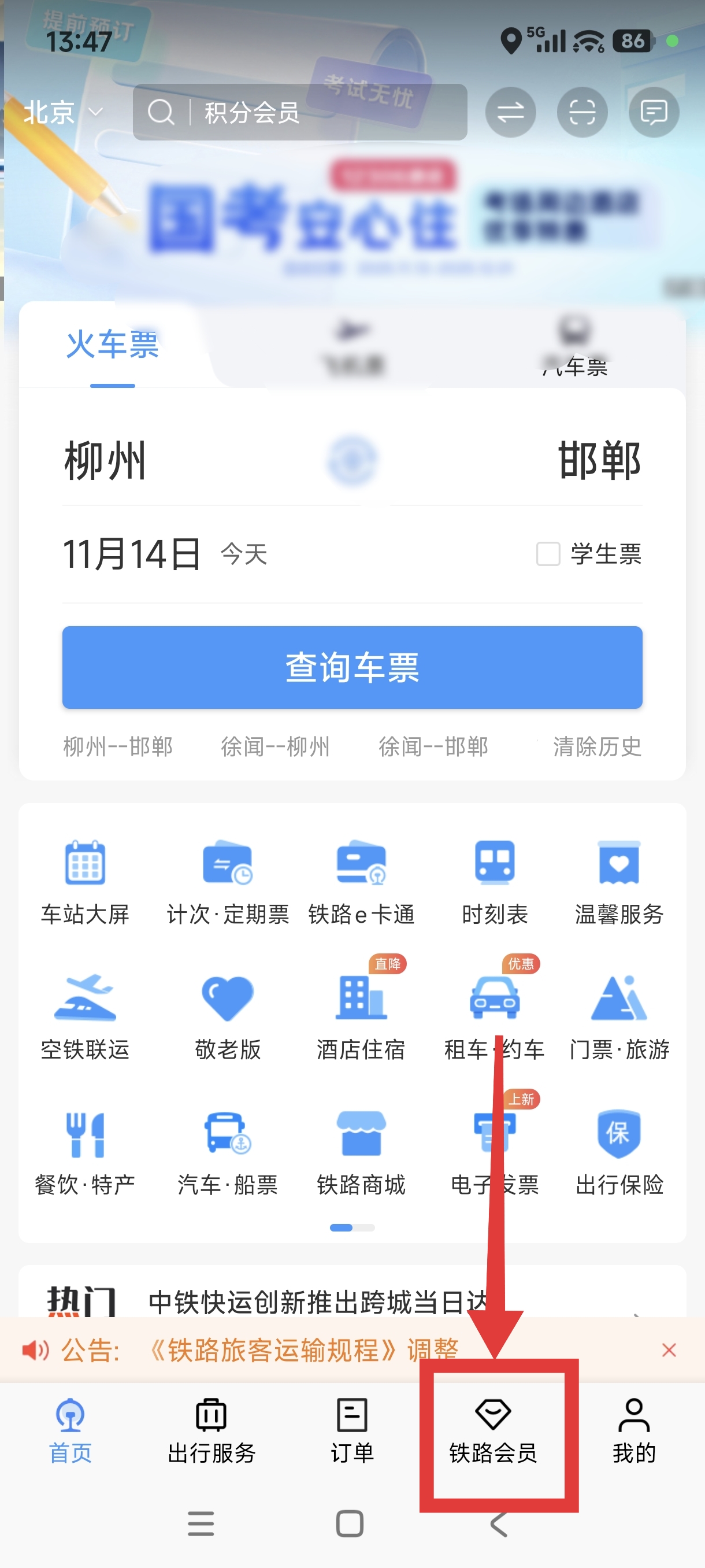 首先打开铁路12306的首页面,然后点击:铁路会员。