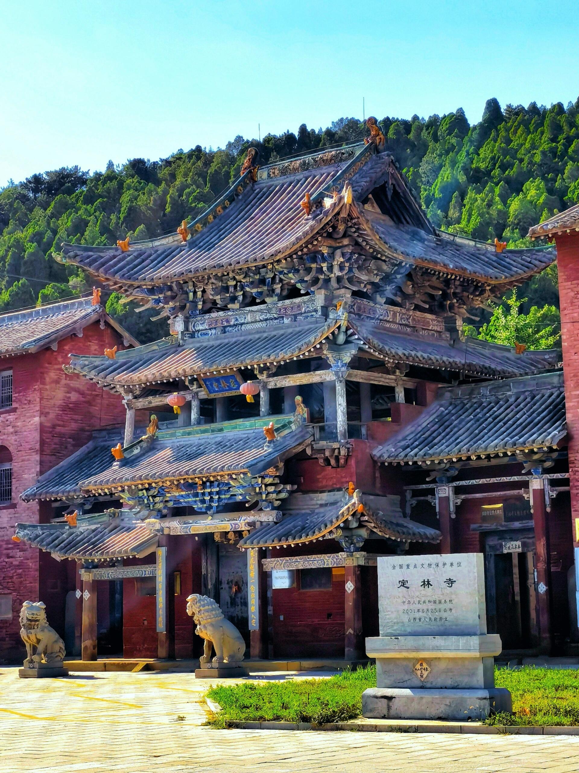 车行高平米山镇的山路间,窗外的绿意渐渐浓得化不开,七佛山南麓的半山腰上,一片错落有致的古建忽然撞入眼帘——定林寺就那样依山而建,殿阁楼亭顺着山势铺展,红墙灰瓦与苍翠草木相映,山风掠过树梢,带着草木的清香与古寺的沉静,瞬间让人明白为何同学说起老家这座千年古刹时,眼中满是藏不住的眷恋。作为2001年入选的全国重点文物保护单位,它不仅是高平22处国保中面积最大的一处,更藏着太多跨越千年的惊喜,从楼阁式山门到金代雷音殿,从独一无二的莲花藻井到生动传神的明代壁画,每一步都踩着历史的印记,每一眼都撞见时光的惊艳。