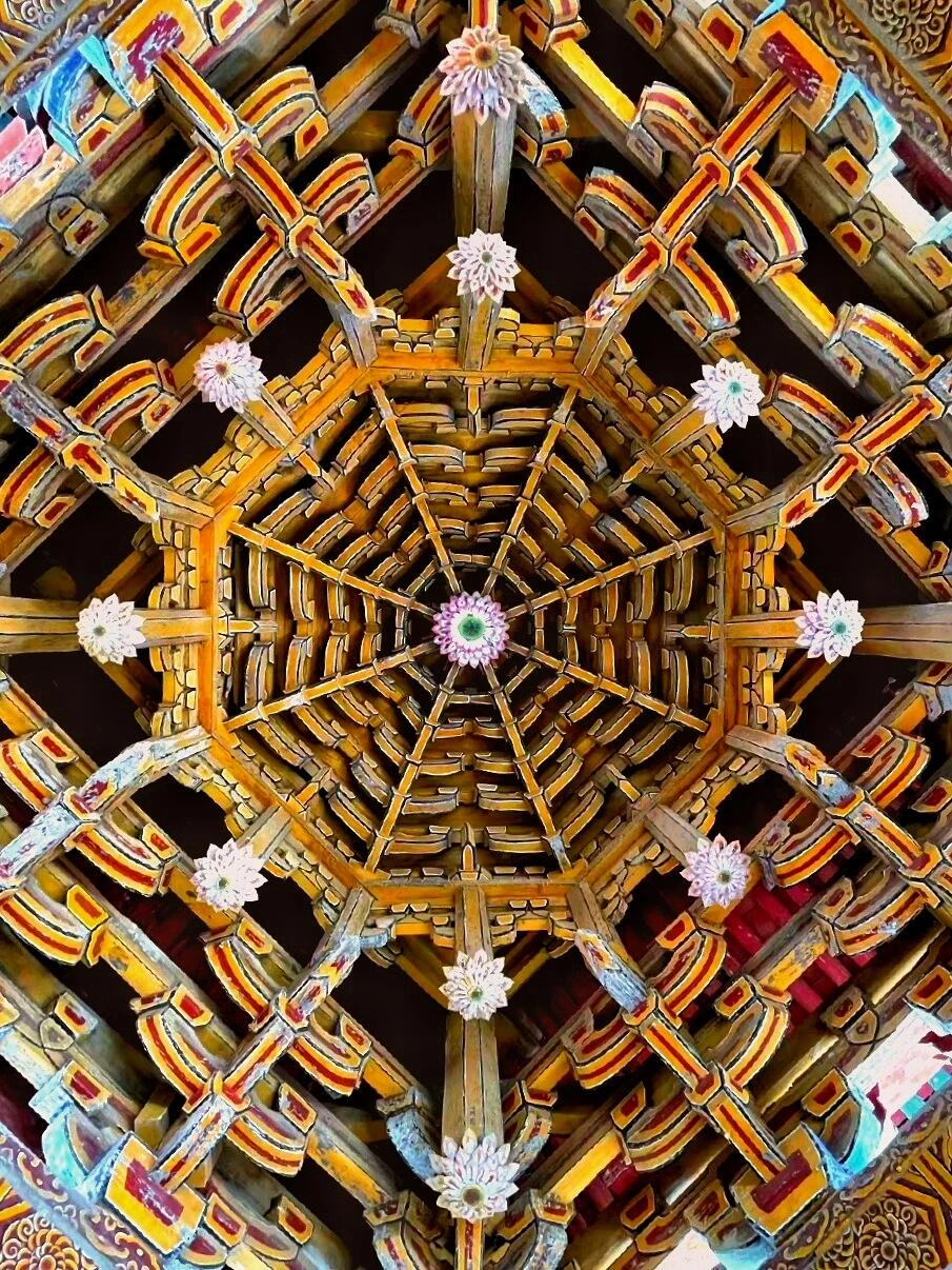 顺着山门左侧的石阶向上,狭窄的木梯仅容一人通过,踩在上面发出吱呀的声响,像是在与历史对话。攀到山门最上层,抬头的瞬间,整个人都被眼前的景象震撼得说不出话来——这便是全国唯一的莲花头垂花柱藻井,造型别致得让人移不开目光。藻井的中心是一朵雕刻精美的圆形莲花,向外八方各延伸出一朵莲花,层层环绕,如同盛开在屋顶的莲座,华美到了极致。莲花的花瓣脉络清晰,边缘圆润,仿佛下一秒就要滴落露珠,色彩虽历经岁月,却依旧鲜艳夺目,红、绿、金三色交织,冷暖相宜,既庄重又不失灵动。这种将力学结构与艺术美学完美融合的设计,让人不得不感叹古代工匠的非凡智慧与想象力,他们用最朴素的工具,创造出了如此惊艳的艺术珍品。