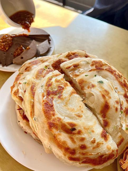 羊汤奶白无膻味,羊杂处理干净脆嫩,泡上现烙死面锅饼,吸满汤汁超入味,撒香菜胡椒更提味。