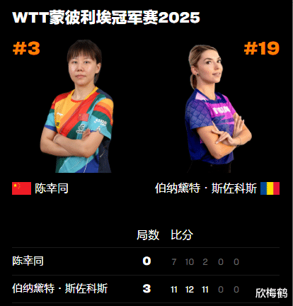 北京时间10月28日晚,WTT蒙彼利埃冠军赛正始打响,女单赛事首战便爆出大冷门。因孙颖莎、王曼昱退出不参加本赛,世界排名第三的陈幸同以头号种子身份出战,本以来开场顺利,却以0-3 不敌世界排名第19位的罗马尼亚名将斯佐科斯,止步32强。