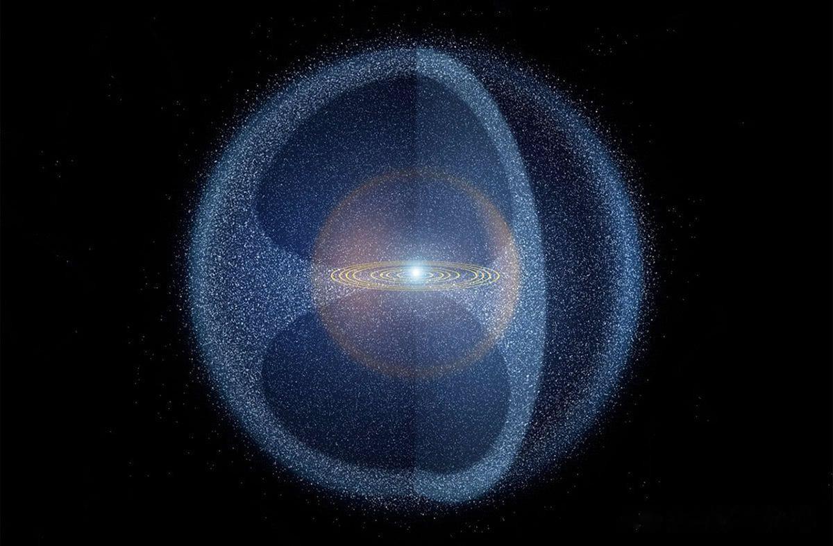 经过这些比较,你是否被太阳系的空旷程度给震惊到了呢?先不要急着震惊!从空间上看,海王星以内的太阳系只是整个太阳系及其微小的一部分,其半径大约只占整个太阳系的0.48‰。太阳系真正的辽阔空间在海王星轨道以外,那里还有辽阔的柯伊伯带和奥尔特云。科学家认为太阳系的半径达到了1光年。如果再加上这部分,在太阳为篮球大小的缩小模型中,太阳系的半径范围可达1632公里。这相当于哈尔滨到南京的直线距离,或者跟月球的半径(1737公里)相当啊!
