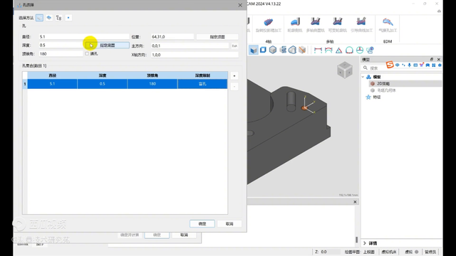 12. 回到参数中,孔选择内,注意到这里的顶锥角,它识别到孔底为平面,在这里要调整它为 118 度,点击确定后来到孔中,勾选刀尖补正,确定并计算,对它进行仿真。可以看到此时多计算了一个刀尖长度,这个刀尖长度会按照 118 度的刀尖角度和刀具直径来进行计算。
