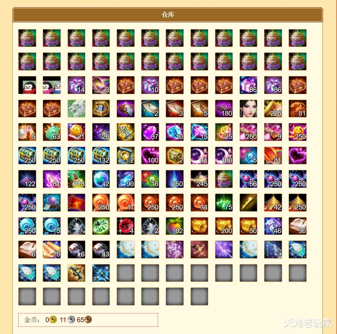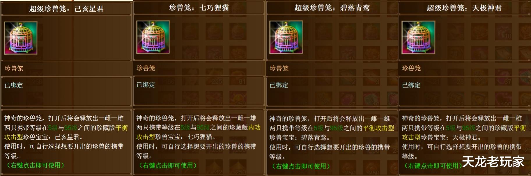 各种珍兽笼子有25个,好家伙,海盗鼠、灵兔兽等大佬专属有好几个不说,经年的年终回馈珍兽也都有,这是攒了至少10年的珍兽啊~