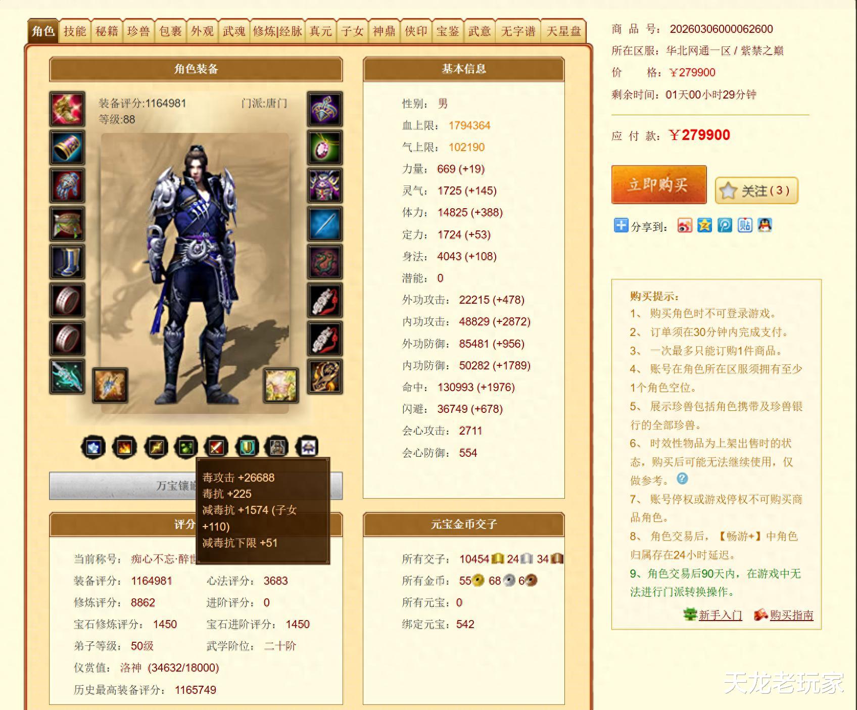 今天给大家介绍的,是来自【紫禁之巅】服务器的卡88级唐门,116万评分,售价近28万!
