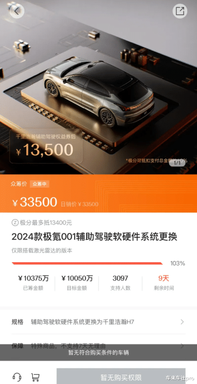 对应的用户成本也摆在明面上:001 车主需要支付 13500 元,目标人数 3000 人;009 车主需要支付 18500 元,目标人数 1500 人。