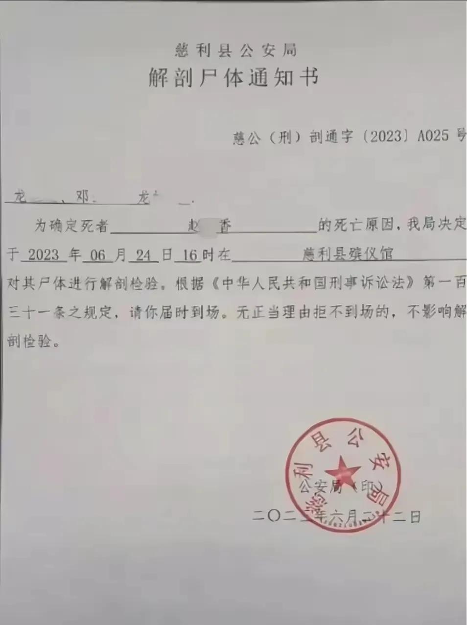 然而面对邓某的请求,当地的回应只是一张尸检通知,上面明确写着,24日的尸检即便是家属不到场也会直接进行,也就是说家属没有权力阻止这件事。
